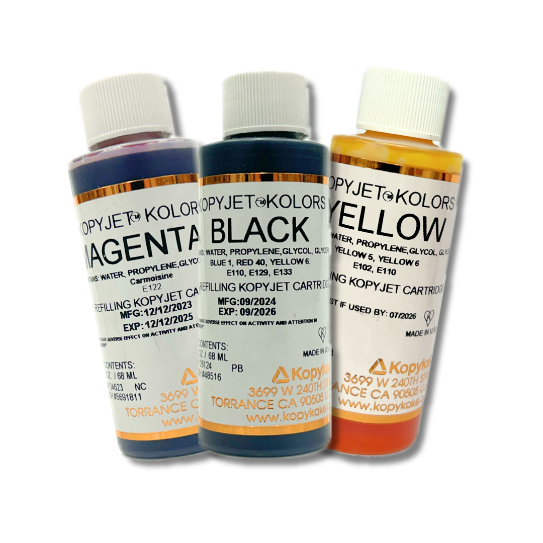 Select from one of KopyKake’s 2oz edible inks, black, yellow, magenta, cyan, or all 4 as a set. Get them either as a refill or to get your started in your edible printing journey!
